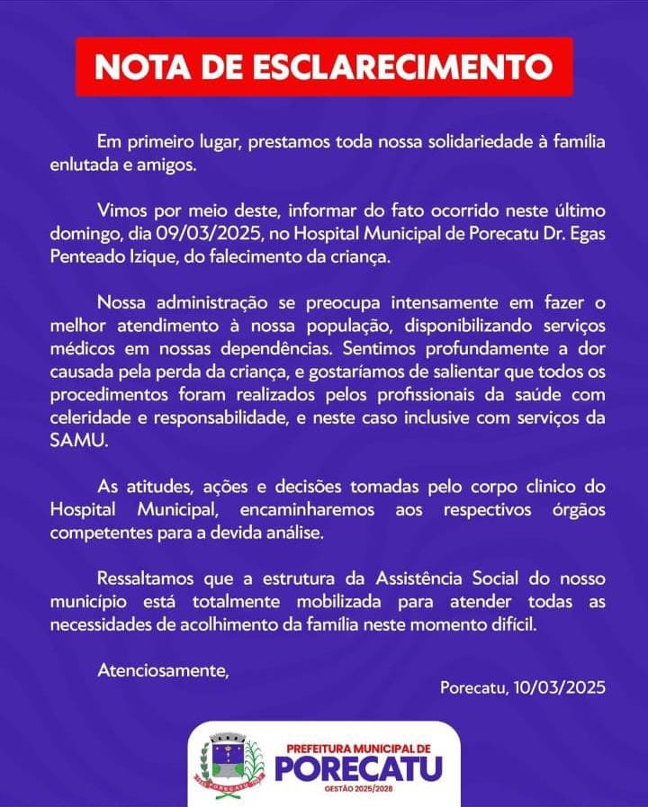 Na noite desta segunda-feira, o Hospital Municipal de Porecatu enviou a seguinte nota: